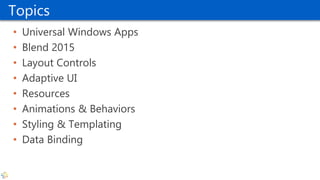 The document discusses the development of Universal Windows Apps using XAML and C#, focusing on the Universal Windows Platform (UWP) and its features such as adaptive UI, layout controls, and animations. It also highlights new tools and capabilities in Blend for Visual Studio 2015, including enhancements to UI debugging and adaptive code, as well as demonstrating how to create user-friendly interfaces across various devices. Additionally, it covers resource management and animations in XAML, providing code examples and insights for developers.