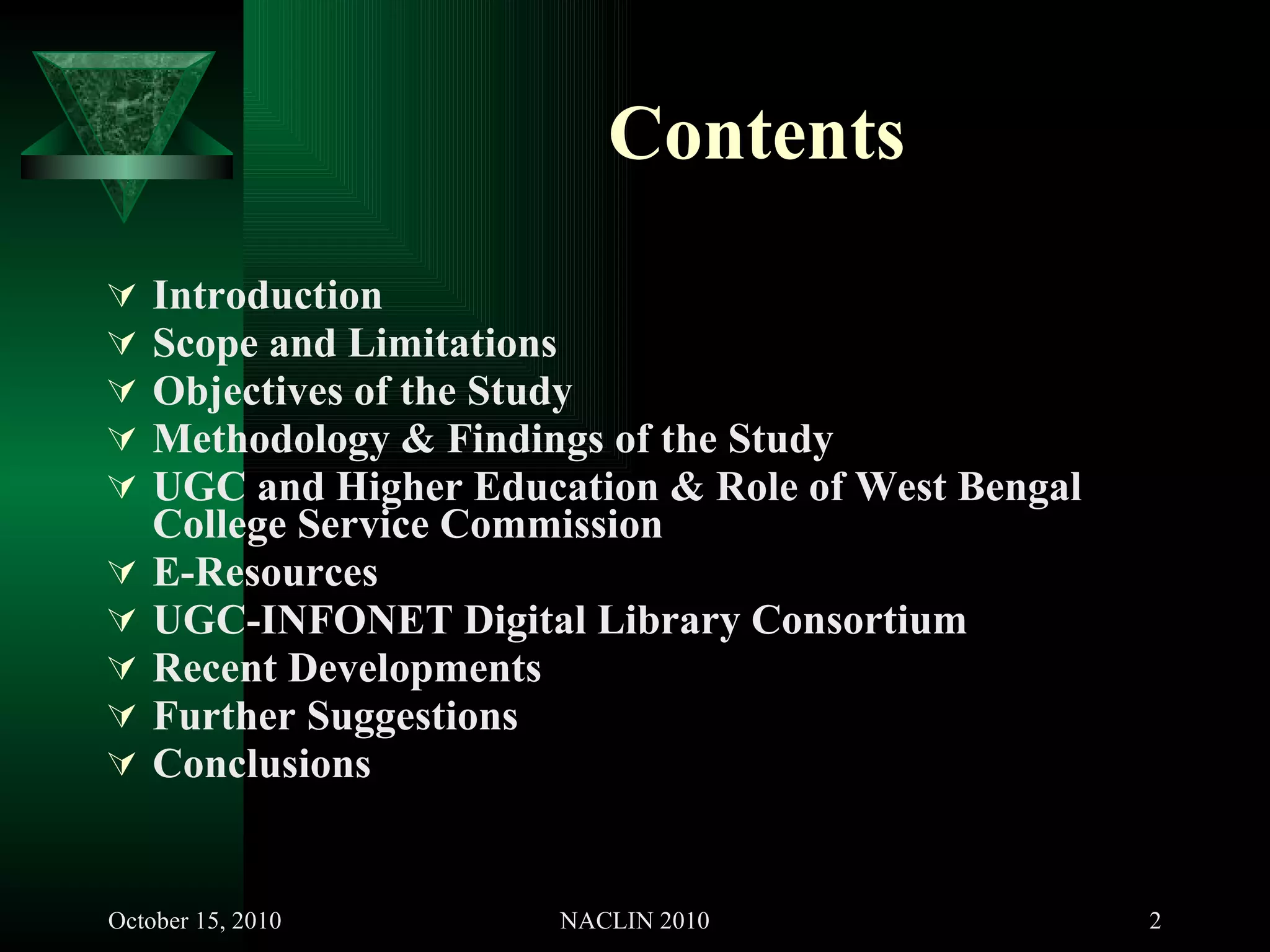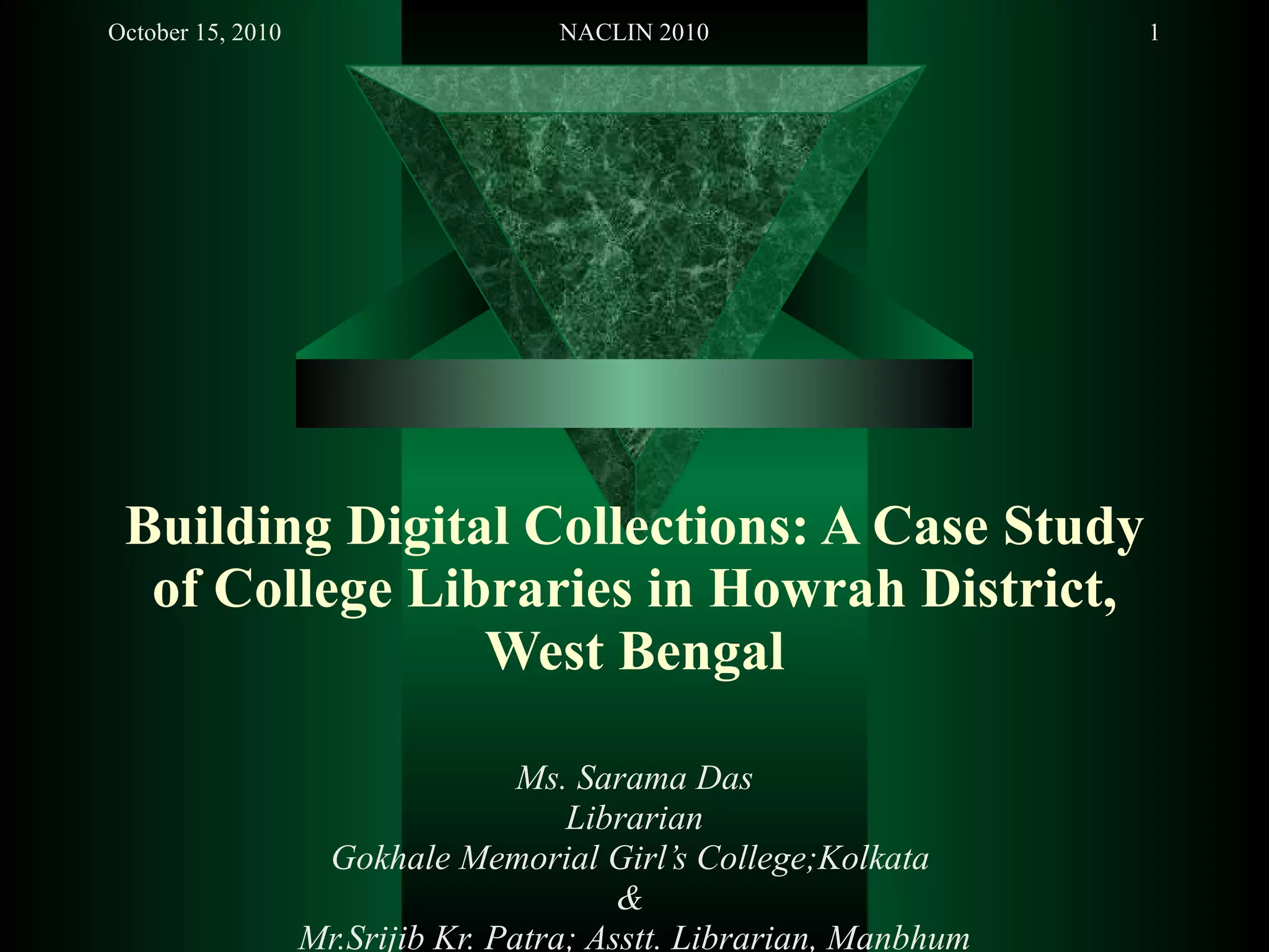 The document discusses a case study of digital collections in college libraries in Howrah District, West Bengal. It found that while many libraries lack permanent staff, some have begun automating services using local software. A few colleges have subscribed to e-resources through UGC initiatives. Recommendations include increasing budgets for digital resources, training staff, and evaluating user feedback to better meet information needs.