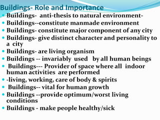 The document discusses the critical role of buildings in urban environments, emphasizing their impact on human growth, sustainability, and resource consumption. It highlights the economic importance of the construction industry in India, detailing the need for cost-effective, sustainable building practices to reduce energy consumption and environmental impact. Key aspects include the life cycle costs of buildings and the necessity for effective design and project management to ensure economic viability and efficiency.