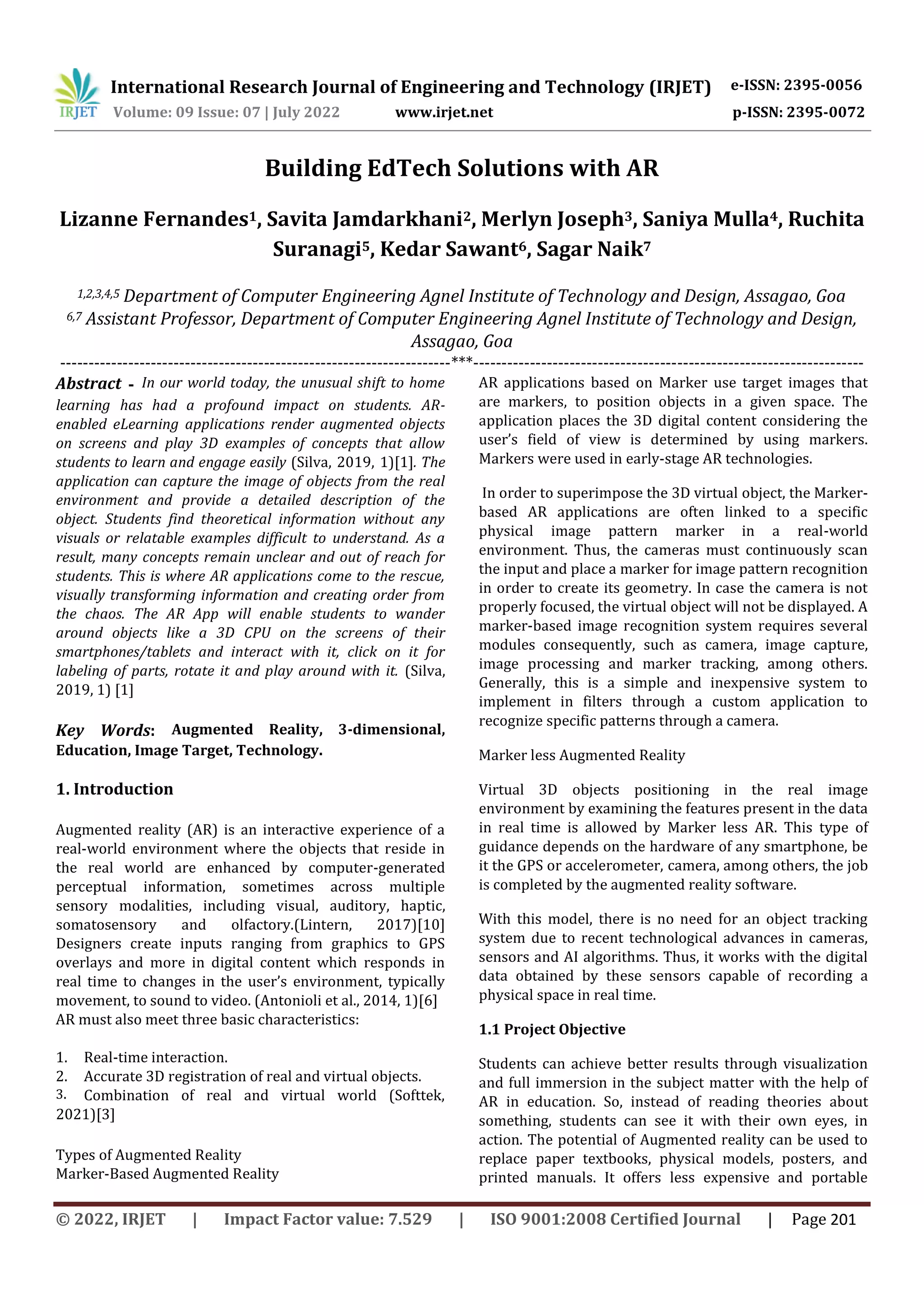 This document describes the development of an augmented reality (AR) mobile application for educational purposes. It discusses the objectives of creating an interactive AR application to help students better understand challenging concepts through visualization. The document outlines the software and hardware requirements, as well as the methodology used, which follows the ADDIE instructional design model. It provides examples of 3D models created for the application's computer hardware, networks, and AI problem-solving modules. The application aims to enhance learning through an engaging, immersive AR experience.