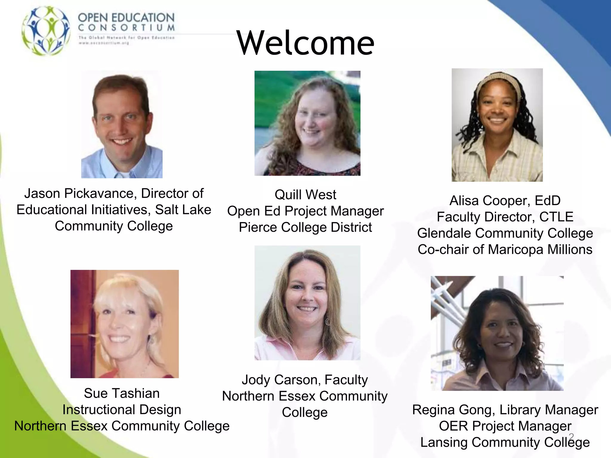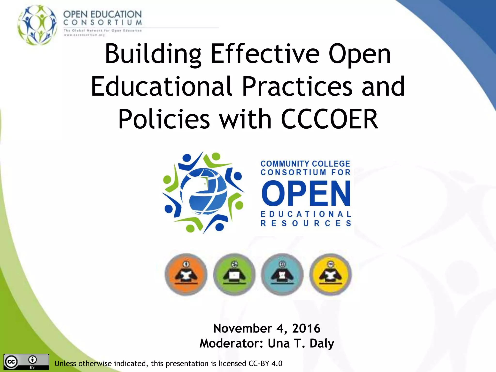 The document discusses the development of open educational practices and policies across various institutions, highlighting collaborative efforts to increase awareness and resource sharing among faculty and students. It outlines initiatives from several colleges including Lansing Community College and Massachusetts community colleges, detailing their strategies, student savings on textbooks, and goals for future open educational resource (OER) adoption. The document underscores the importance of community involvement in expanding the open education movement and improving student success.