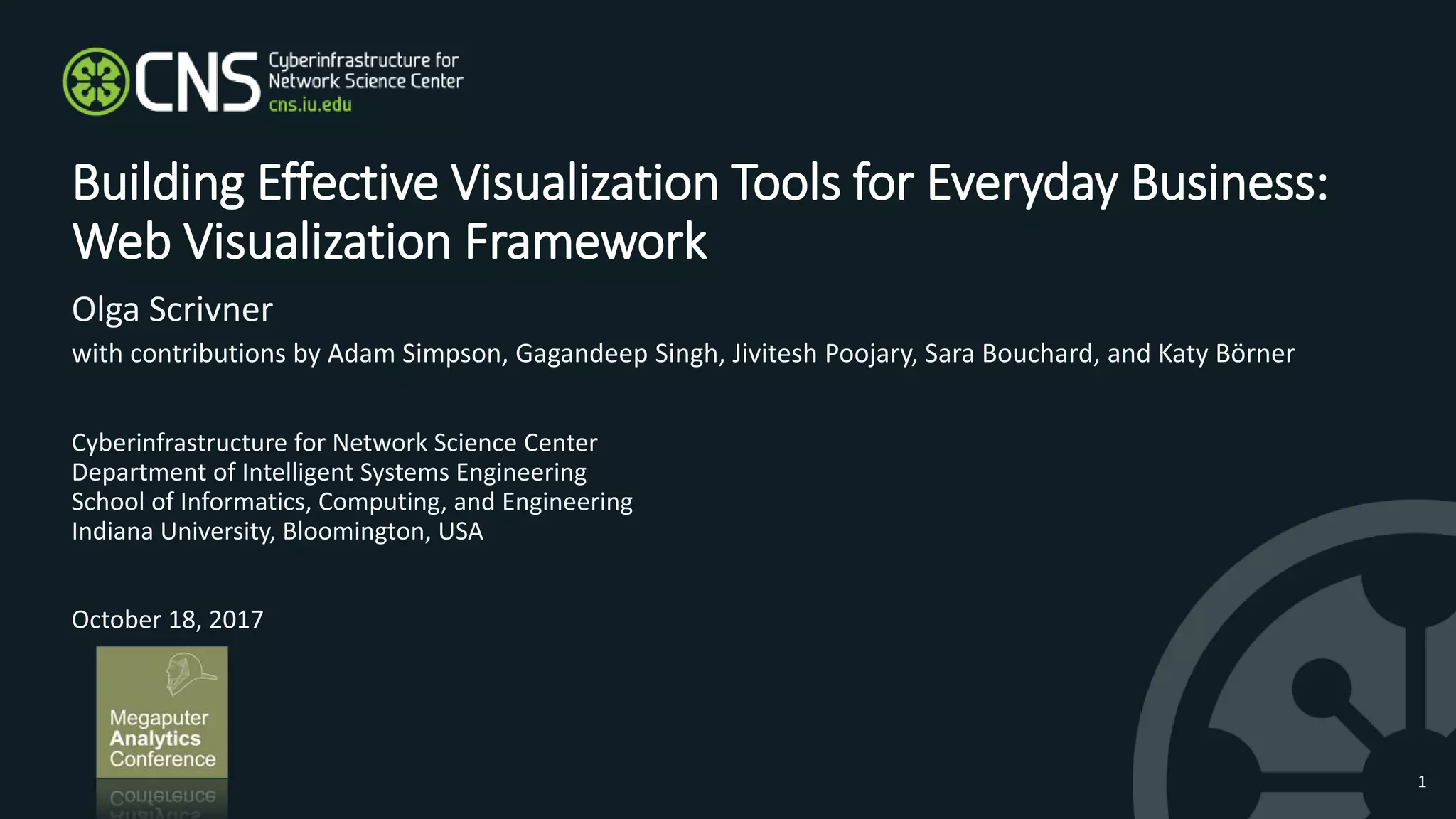 This document provides an overview of web visualization tools and frameworks for business intelligence and data visualization. It discusses reactive web frameworks, the Shiny application framework from RStudio, and the Web Visualization Framework (WVF) developed by the Cyberinfrastructure for Network Science Center. Examples of visualizations created with Shiny and WVF are presented, including Sankey diagrams, streamgraphs, heatmaps, and network maps. The document concludes by discussing the future outlook for WVF and promoting an online course on information visualization.