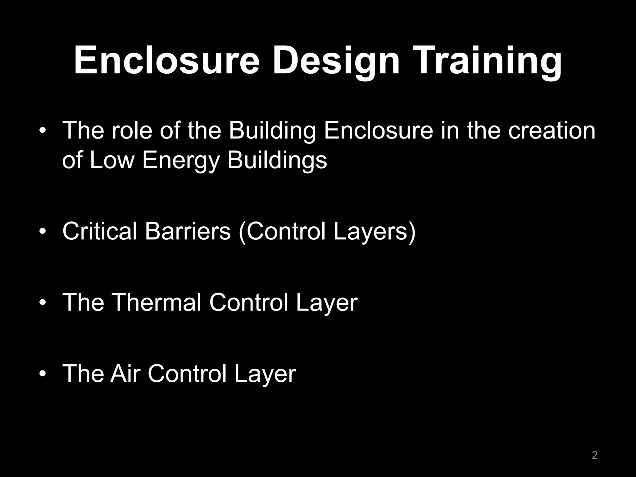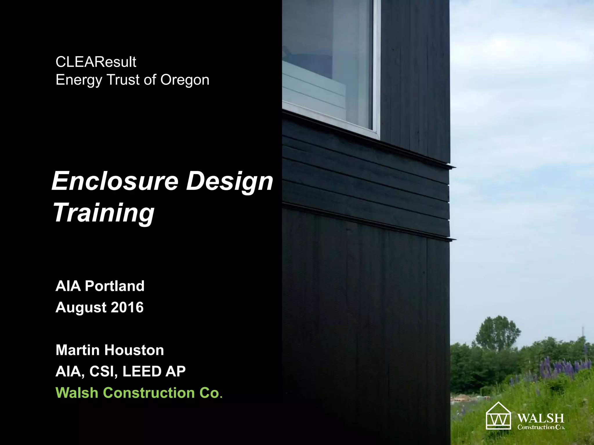 This document provides an overview of an enclosure design training presentation focused on low energy buildings. The presentation covers definitions of key terms, the five critical barriers in enclosure design including the thermal and air barriers, approaches to designing continuous barriers, and details of enclosure assemblies. It emphasizes the importance of continuity, airtightness, insulation, and coordination between building systems in achieving energy efficiency and durability. Case studies are presented on high performance building enclosures and MEP designs.
