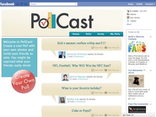 The document provides an overview of building applications on the Facebook platform, discussing its large user base, development landscape, and various application types. It details the necessary steps for getting started, including creating a Facebook account and registering apps, while also offering practical tips and code examples for implementation. The document serves as a survival guide for developers navigating the evolving Facebook development environment, highlighting best practices and integration techniques.