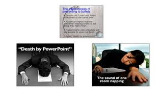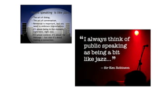 This document provides tips and advice for creating effective presentations. It discusses crafting a story-driven narrative, focusing on simplicity and reducing unnecessary content. Visual design recommendations include using imagery, asymmetry, and consistent formatting. The importance of practicing delivery techniques like moving away from the podium and making eye contact is also covered. The summary concludes by recommending further reading on public speaking and presentation skills.