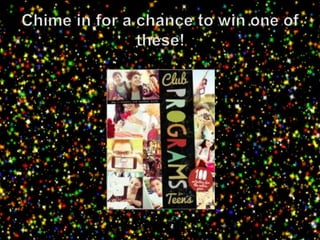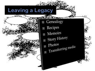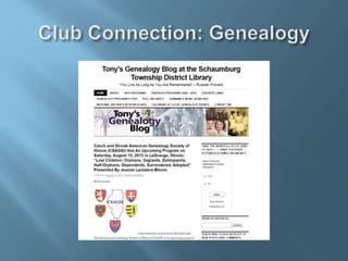 The document provides information and ideas for senior programs at libraries. It discusses trends to replicate, topics of interest to seniors such as health and fitness, crafts, history, and technology training. It also provides suggestions for growing existing clubs and partnerships with other organizations. The document aims to help libraries engage older adults through social, educational, and entertaining programming.