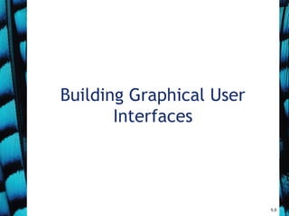 This document discusses building graphical user interfaces in Java. It covers GUI principles like components, layout, and event handling. It also describes common Swing and AWT components like frames, menus, buttons and how to arrange them. The document uses an image viewer application as an example to demonstrate creating GUIs, loading images, handling events, filters and other GUI features.