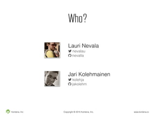 The document outlines the use of Docker to build high availability applications, featuring a detailed architecture overview and capabilities like advanced orchestration and automatic node discovery. It highlights the ease of using Docker with practical examples, including a command to run a Ghost container. The content emphasizes Kontena, Inc.'s offerings, including multiple project support and a commitment to open-source principles.