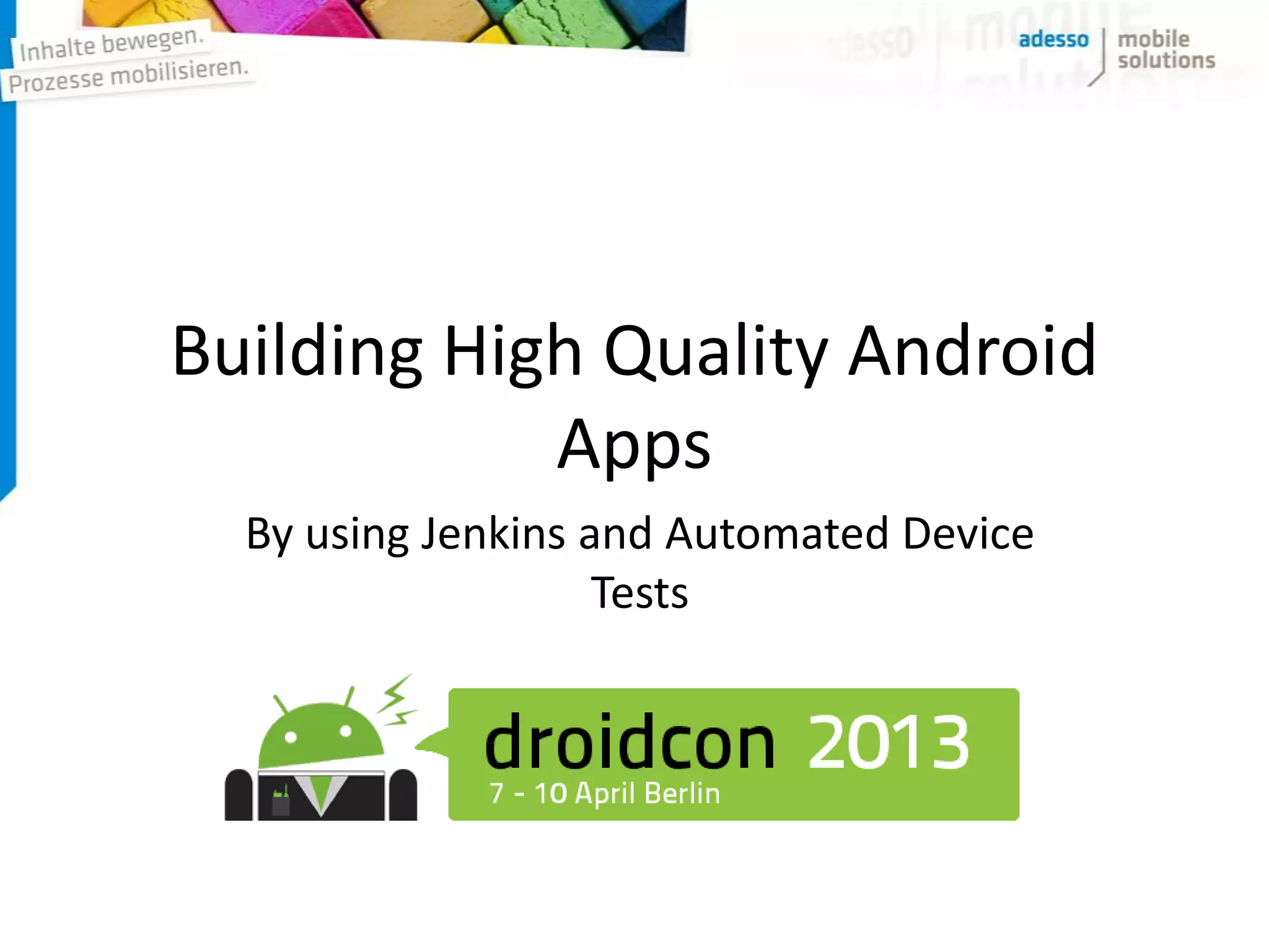 The document discusses building high-quality Android apps using Jenkins and automated device tests, emphasizing the importance of a reliable development workflow and continuous integration to manage the increasing complexity of apps and device fragmentation. It highlights the need for automated testing to reduce the burden on developers and improve app quality, using tools like Calabash for automated UI tests. The presentation outlines the benefits of automation, including fewer errors, faster feedback, and happier developers.