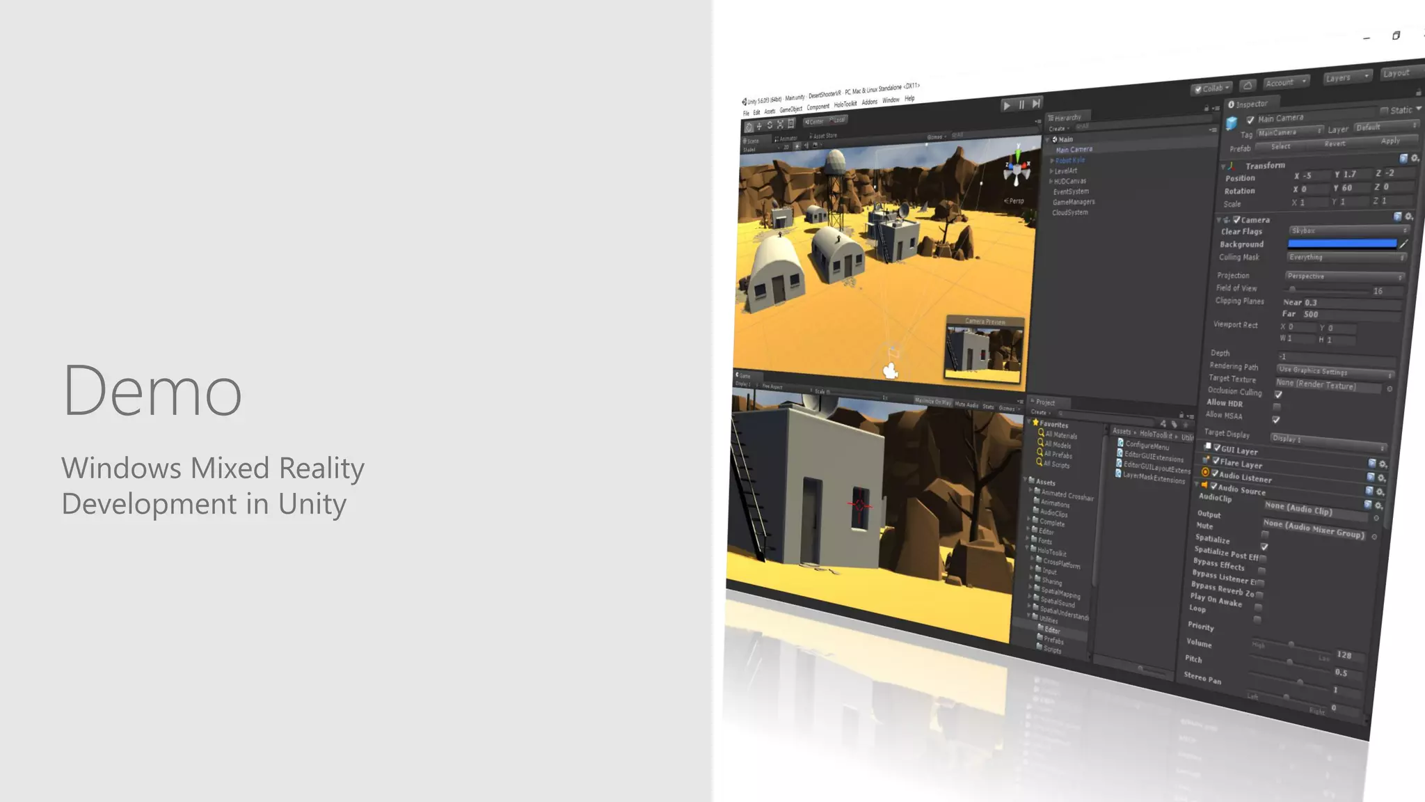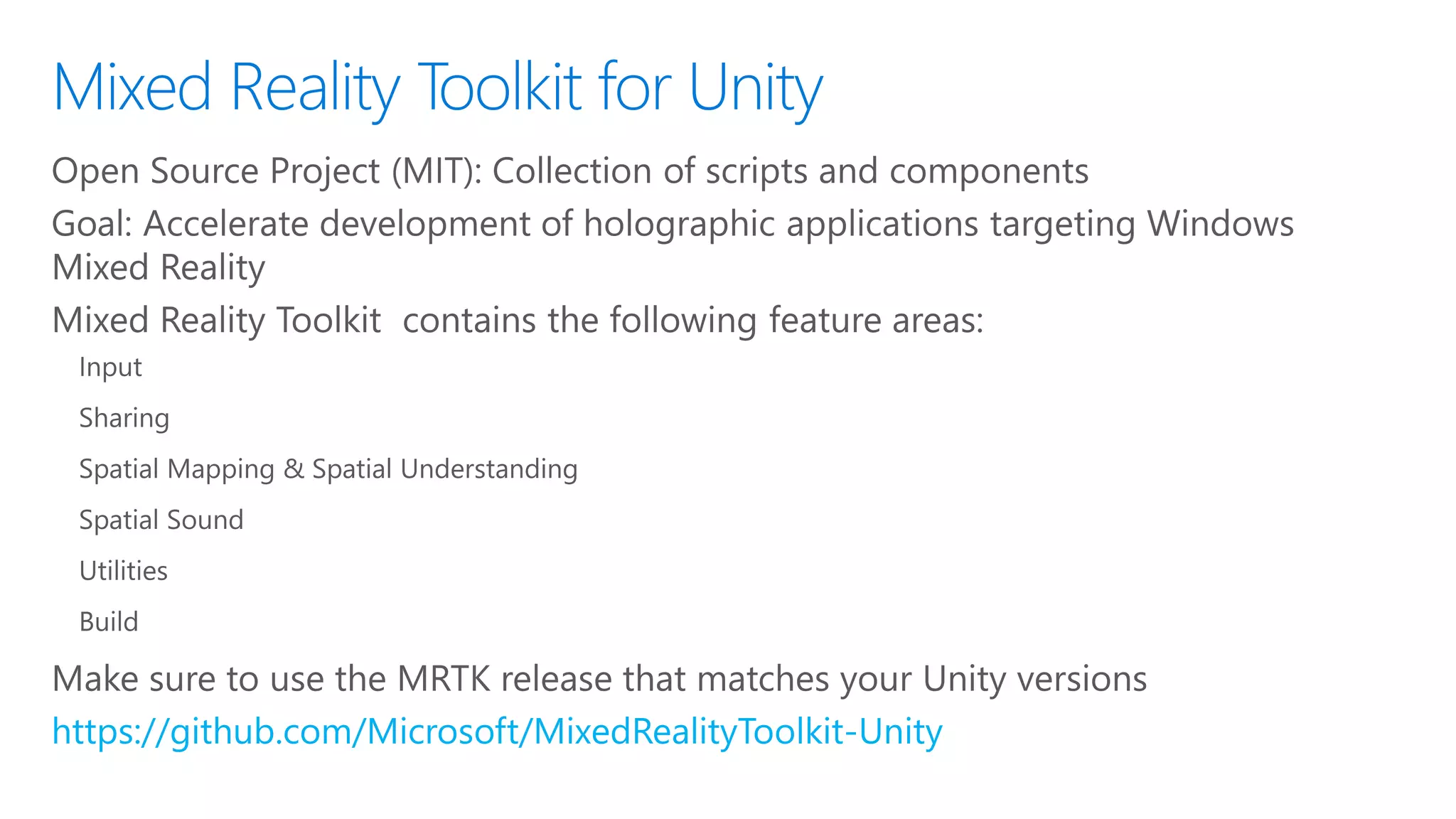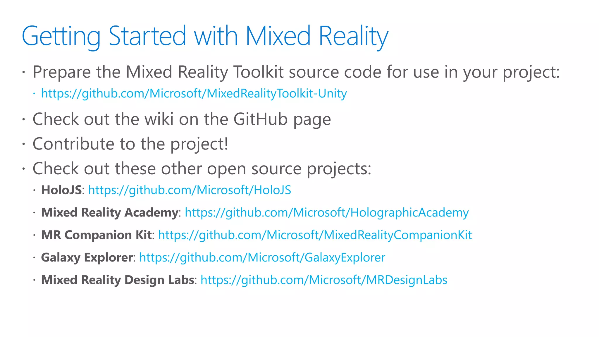 The document provides an overview of building holographic and virtual reality experiences using Microsoft's Mixed Reality Toolkit for Unity, emphasizing the distinctions between mixed reality, augmented reality, and virtual reality. It details the hardware specifications for various Windows Mixed Reality headsets, features of Microsoft HoloLens, development resources, and community engagement opportunities for developers. Additionally, it highlights the Universal Windows Platform as a means to create applications across different mixed reality devices, along with links to tools and tutorials for further support.