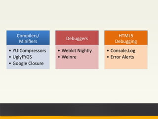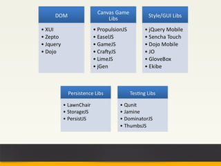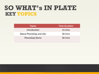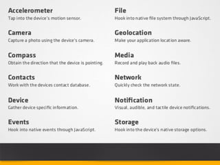 PhoneGap allows developers to build mobile apps using standard web technologies like HTML, CSS, and JavaScript. It works by packaging web apps so they can be deployed and run as native mobile applications on different platforms. The document discusses how to build an Android app using PhoneGap, including setting up the project structure, adding the PhoneGap library, implementing a basic "Hello World" app, and extending functionality through plugins. It also covers debugging PhoneGap apps and some limitations compared to native development.
