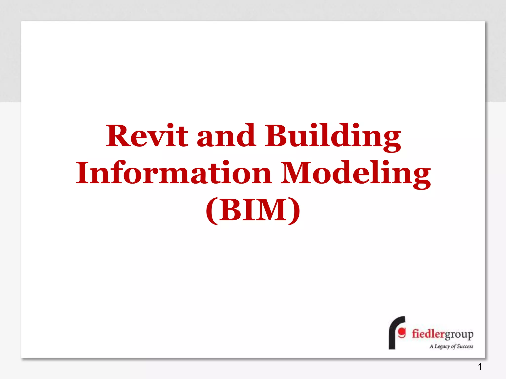 Building Information Modeling (BIM) is a process for generating and managing building data throughout its life cycle using 3D modeling software like Revit to enhance productivity. The implementation by Fiedler Group included retraining staff and addressing challenges such as the lack of trained designers and availability of BIM libraries. Key benefits of BIM include improved construction drawing quality, reduced preparation time, and easier extraction of material quantities for cost estimating.