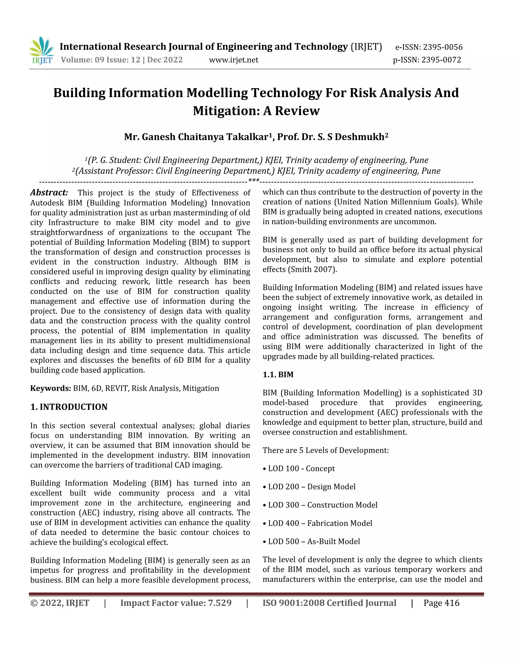 This document provides a review of using Building Information Modeling (BIM) technology for risk analysis and mitigation in construction projects. It discusses the benefits of BIM for risk management, including enabling more accurate and timely risk assessment to reduce time and costs while improving quality and safety. BIM software can accelerate the risk management process by providing all required project information in a unified way. The document also reviews several other studies that examine topics like BIM implementation in different countries, clash detection using BIM, the impact of total quality management on organizational performance, and applications of BIM in prefabricated building design.