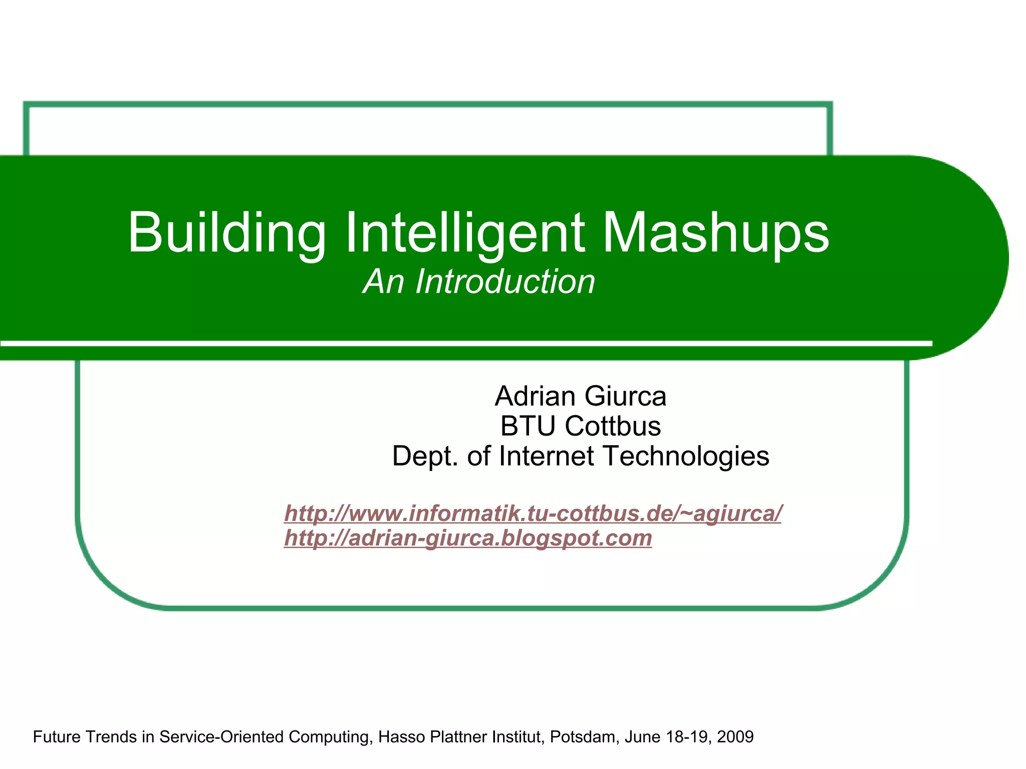 The document discusses building intelligent mashups using artificial intelligence techniques. It proposes using JSON-based rules that can be run in a browser-based rules engine to combine data from different web sources and applications. This would allow non-programmers to more easily create intelligent mashups by specifying event-condition-action rules without advanced coding skills. Open challenges discussed include a lack of widget standards and potential security and performance issues.
