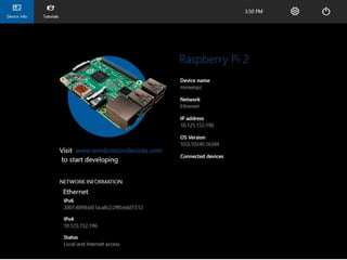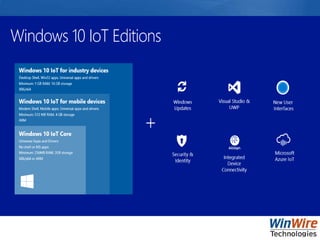 This document is a webinar overview of building IoT solutions using Windows IoT Core, featuring insights from industry experts. It outlines the development process for Universal Windows Platform (UWP) applications on Windows 10 IoT Core, including using Azure for backend services, with a practical project example focused on water management. Key resources and setup steps for developers are also provided, alongside an invitation to the next webinar on Cortana Analytics.