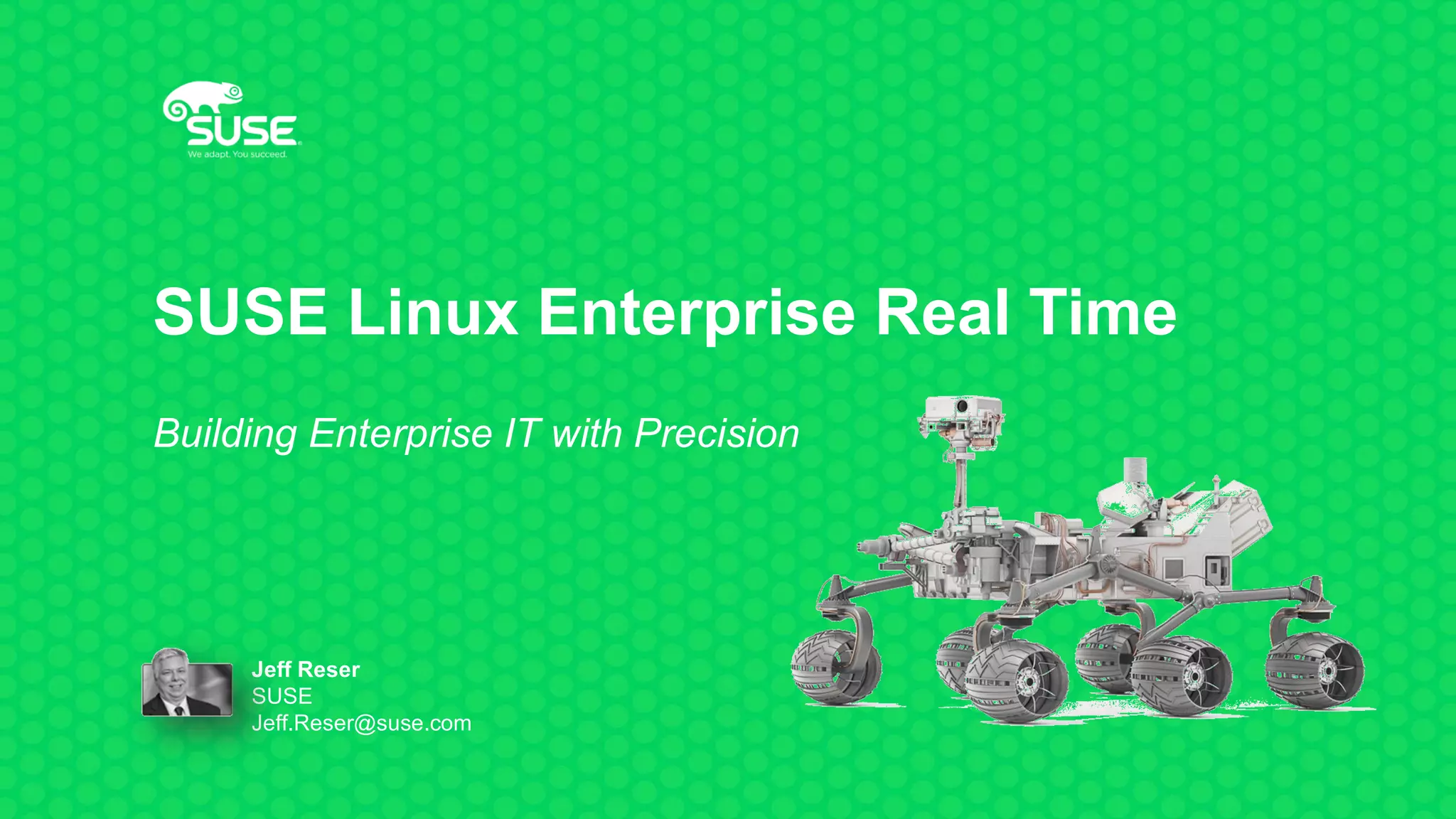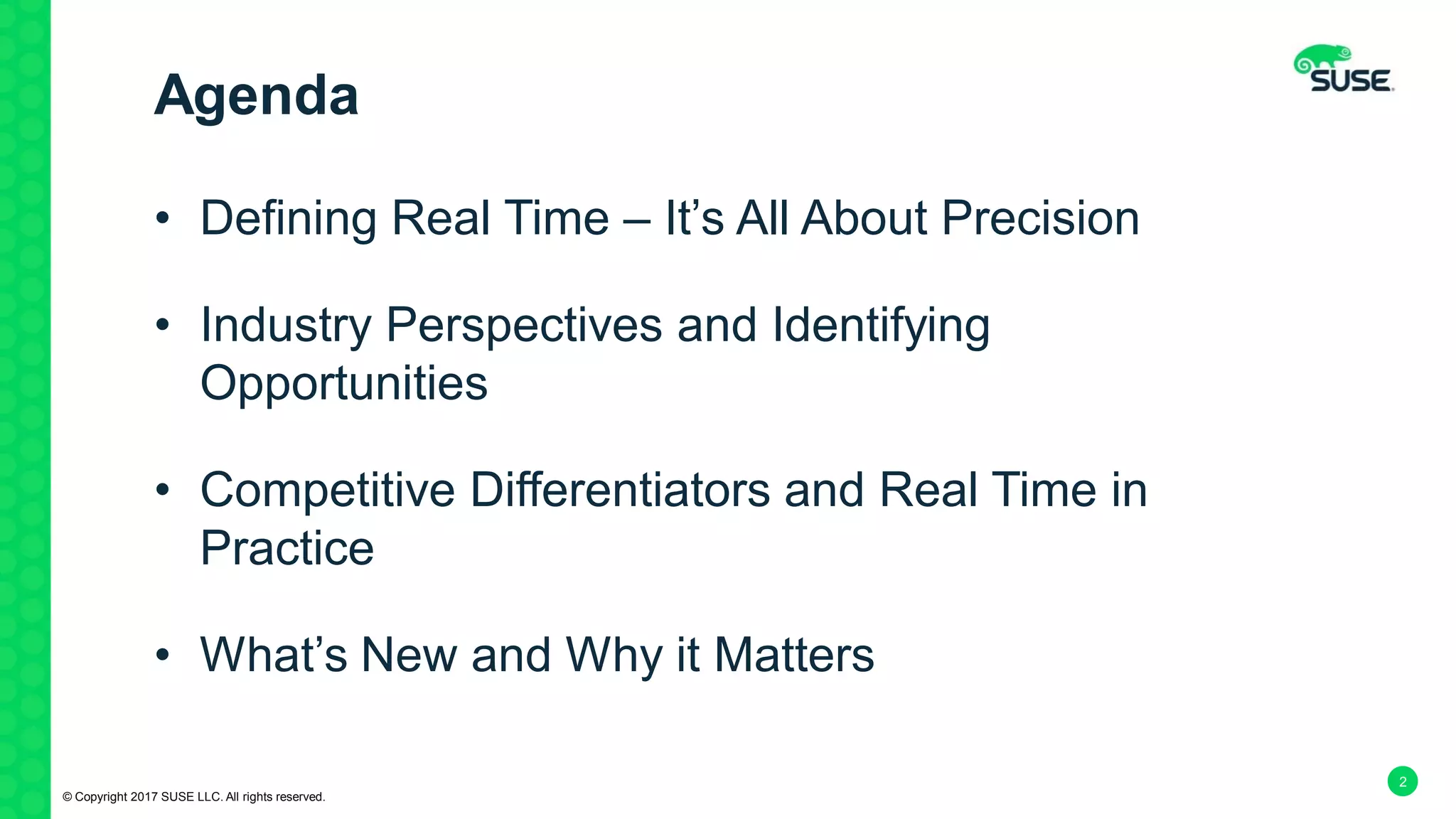 SUSE Linux Enterprise Real Time provides a real-time operating system built on SUSE Linux Enterprise. It offers features like hierarchical prioritization, integrated application tracing tools, and precision time protocol that allow for more predictable, reliable and low-latency execution of time-sensitive applications. Examples of industries that benefit include manufacturing, telecommunications and finance. The latest version further strengthens reliability, reduces latency and increases predictability through improvements like CPU shielding, smarter scheduling and virtualization support.