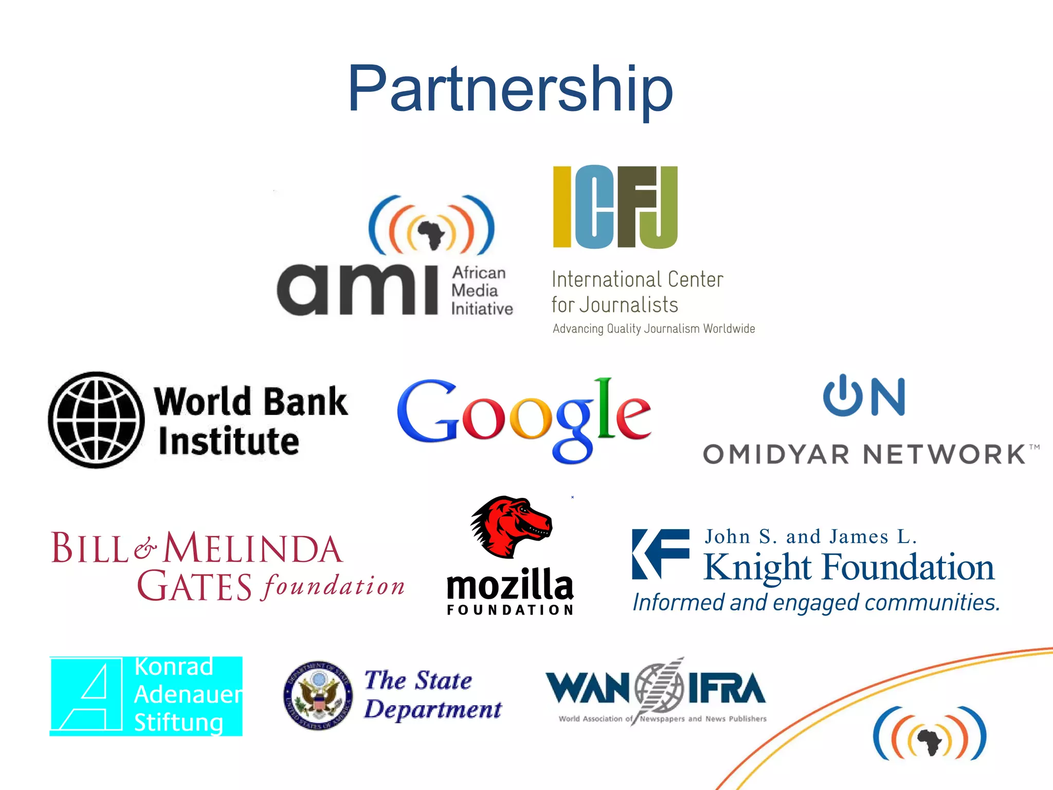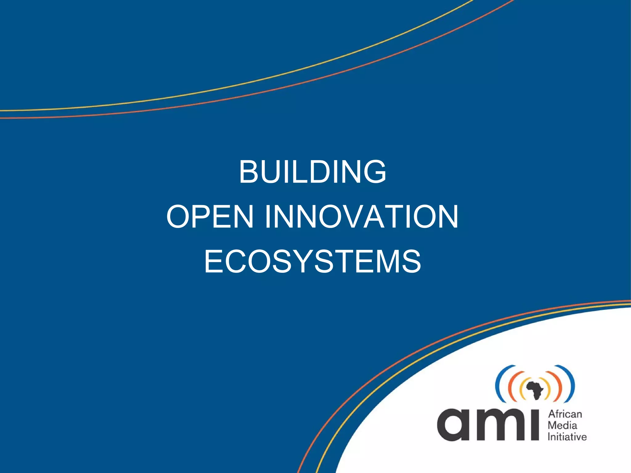 AMI is a network representing 800+ influential African media companies and organizations. It focuses on helping the media industry adapt to changes like shifting audiences and business models online. AMI is building an open innovation ecosystem through various programs, partnerships and funding opportunities to help African media transition to digital platforms and use data and technology effectively. This includes challenges, grants and initiatives that provide skills training, prototyping support and access to venture funding to create sustainable business models.