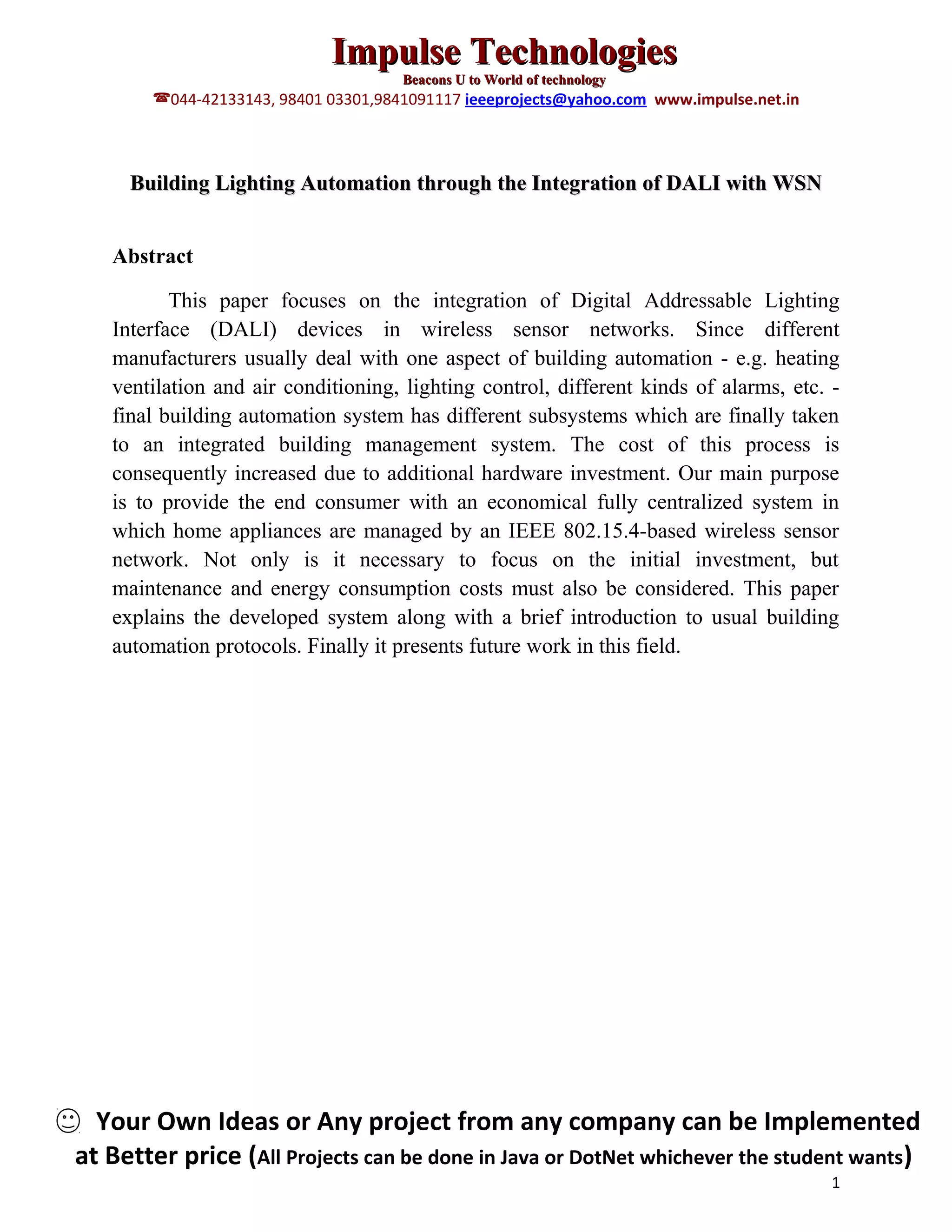 This paper discusses the integration of Digital Addressable Lighting Interface (DALI) devices with wireless sensor networks to create a centralized building automation system. It highlights the cost advantages of this approach, considering initial investment, maintenance, and energy consumption. The document also provides an overview of existing automation protocols and outlines potential future work in the field.