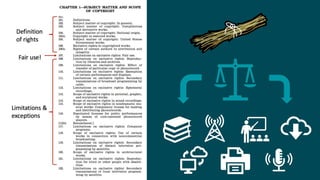 The document discusses copyright and fair use in the context of digital projects, focusing on text data mining (TDM) and the legal frameworks surrounding it. It outlines the essentials of copyright law, including what can and cannot be copyrighted, the concept of fair use, and relevant case studies that illustrate transformative uses of copyrighted material. The document emphasizes the importance of understanding fair use for researchers and the potential legal implications of using copyrighted works in TDM.