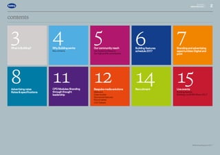The document provides information on advertising and branding opportunities with Building magazine across digital, print, and live platforms. It details Building's community reach through its weekly print magazine, website, social media, and live events. Advertising options are described for the magazine's print and digital editions, including display ads, custom publishing, and sponsored sections. Building's audience metrics and contacts are also listed.