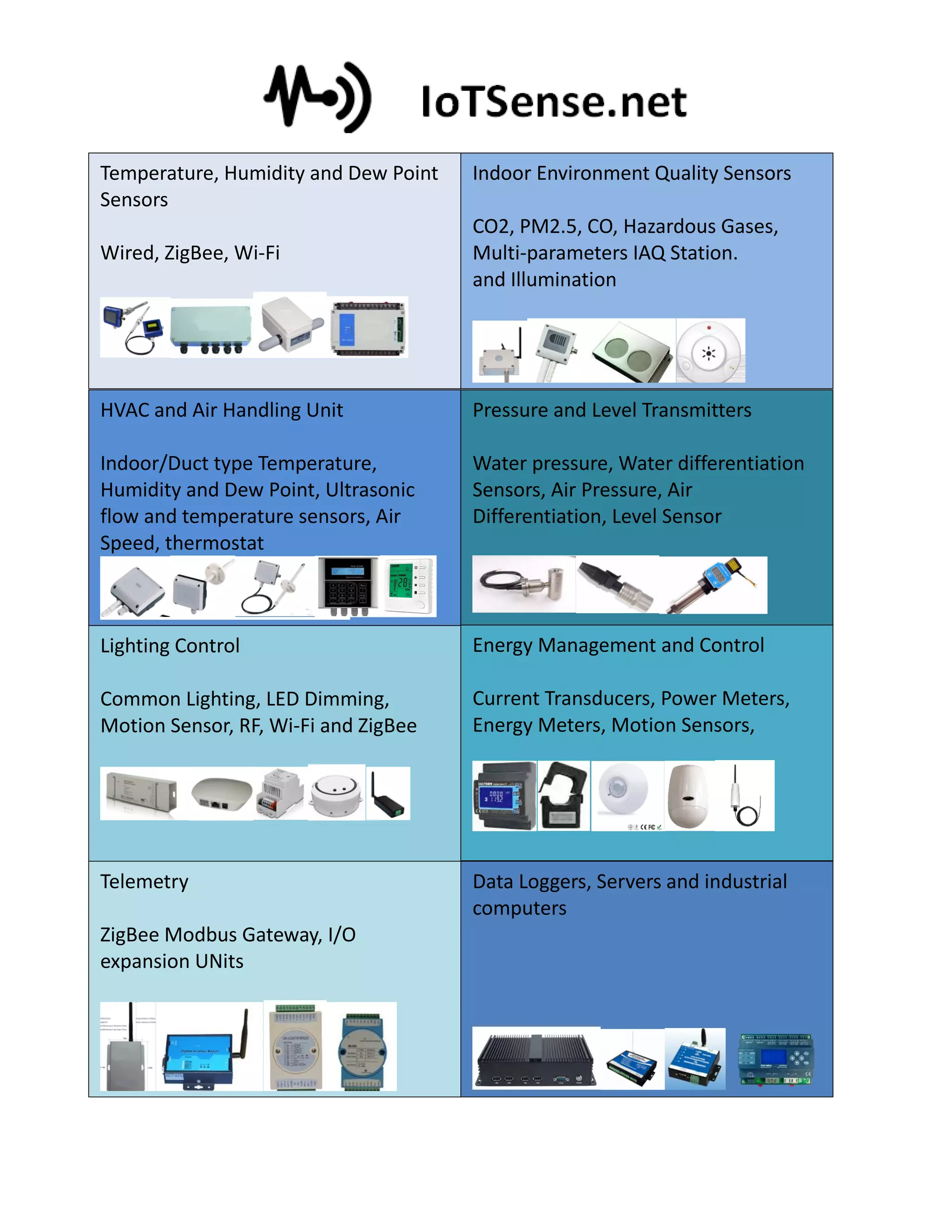 The document discusses sensors and devices for building management systems, including those for climate control, indoor environmental quality monitoring, HVAC systems, pressure and level sensing, lighting control, energy monitoring and control, telemetry, and data logging. It provides examples of sensor and device recommendations for various building management applications such as HVAC air handling units, chiller plant monitoring, indoor air quality monitoring, and energy monitoring. The company IoTsense.net provides these sensors, telemetry equipment, data loggers, servers, and industrial computers which are suitable for building automation and management systems.