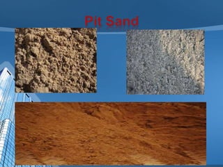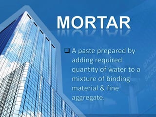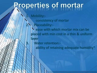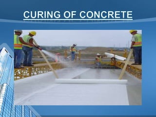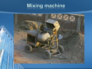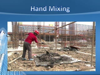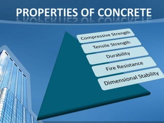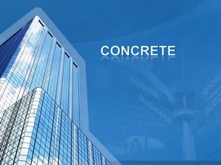 This document provides information on concrete, its ingredients and properties. Concrete is composed of Portland cement, water, aggregates (sand and gravel/crushed stone) and sometimes admixtures. It is mixed either by hand or machine. The cement and water form a paste that binds the aggregates together as it hardens. Concrete has high compressive strength but low tensile strength. Proper curing is required for concrete to attain its full strength. Concrete is a versatile building material with many applications.