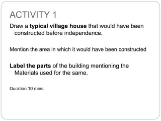 This document discusses building materials used in rural construction before independence. It describes materials like mud, lime, bamboo, stone, clay bricks, coconut leaves, jute and palm leaves that were commonly used. It then provides details on soil as a building material, including its formation, classification systems, properties and various tests conducted on soil.