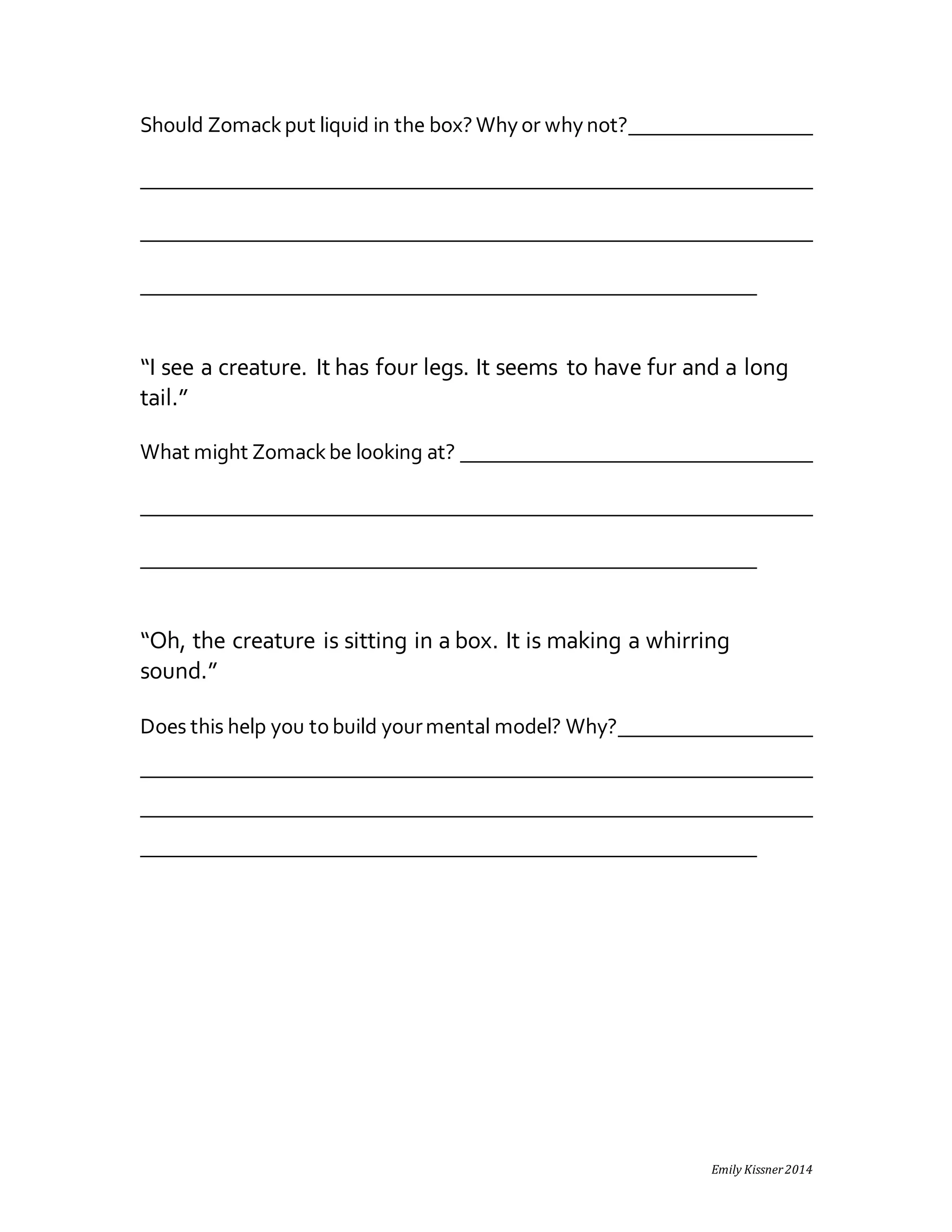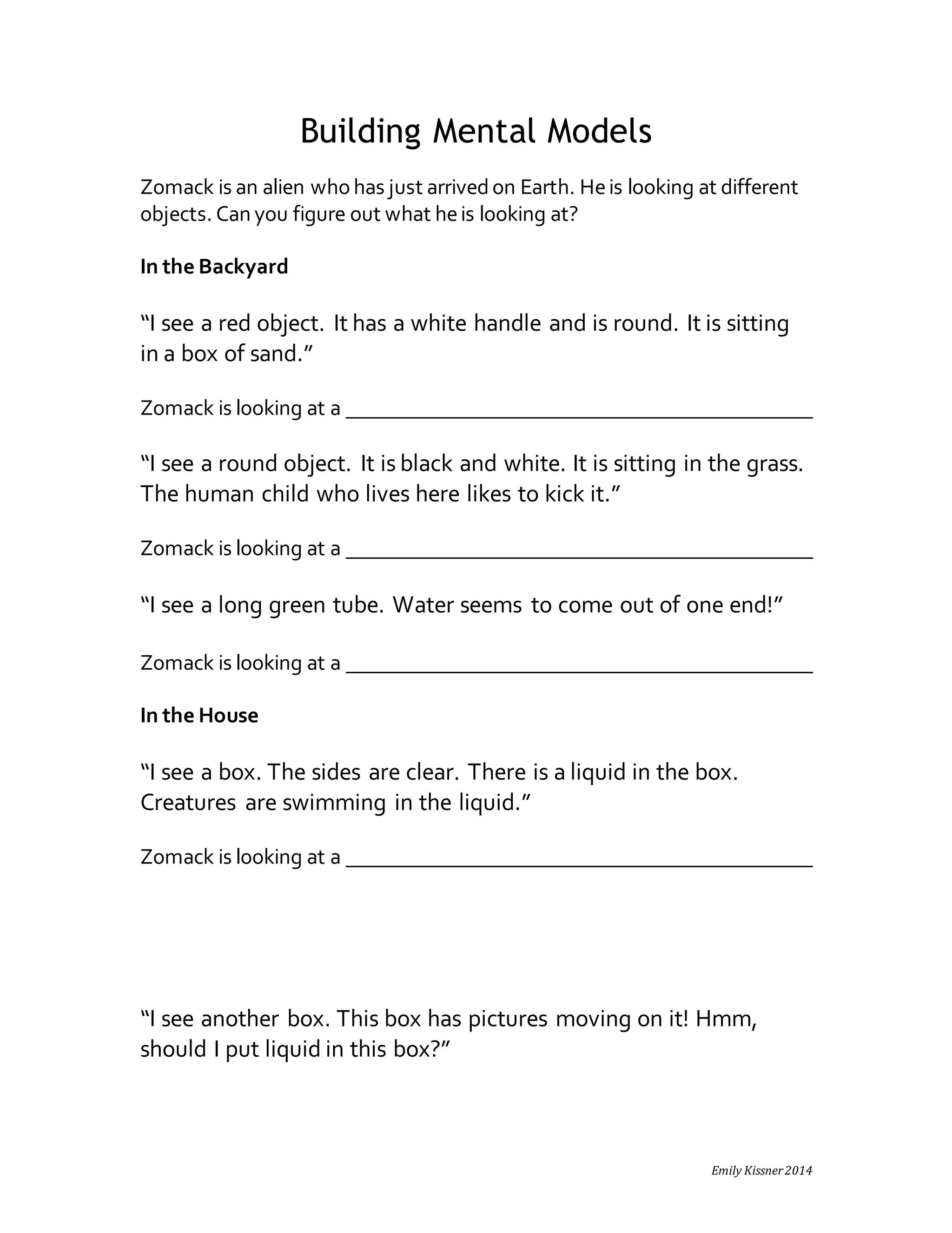Zomack is an alien visiting Earth who is looking at various objects and trying to figure out what they are. He describes seeing a red ball in a sandbox, a black and white ball in the grass that children kick, a long green tube with water coming out of one end, fish swimming in a clear box of liquid, pictures moving in another box without liquid, and a furry creature with a long tail making a whirring sound while sitting in a box.