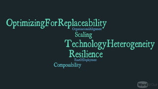 Microservices are small, autonomous services that work together to perform specific functions. They are loosely coupled and have high cohesion. Each service should have a bounded context and explicit boundaries to define its responsibilities. Integration between microservices should avoid breaking changes, be technology agnostic, and simple for consumers by hiding internal implementation details. The shared database should be avoided for integration, and REST is recommended for request/response integration over synchronous/asynchronous messaging. Testing should focus on fast feedback through consumer-driven contracts instead of flaky end-to-end tests. The system design will likely reflect the organization's communication structure.