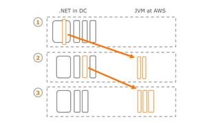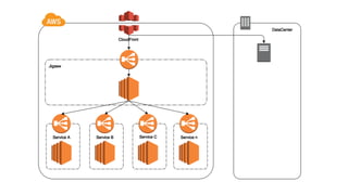The document discusses transitioning from monolithic architecture to microservices in a cloud environment, emphasizing a culture of collaboration, data-driven decision-making, and autonomous teams responsible for product management. It highlights principles such as maintaining loose coupling, leveraging AWS services, and automating infrastructure for efficiency. Key themes include security and data privacy considerations, the importance of fast feedback, and creating teams organized around business capabilities.