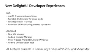 James Montemagno, Principal Program Manager at Microsoft, discusses mobile developer tools, highlighting Xamarin's unique approach to building native applications using a shared C# codebase. The document outlines the comprehensive API coverage for iOS and Android, as well as the advantages of using Xamarin for cross-platform development. Additionally, Montemagno promotes his development podcasts and resources for developers.