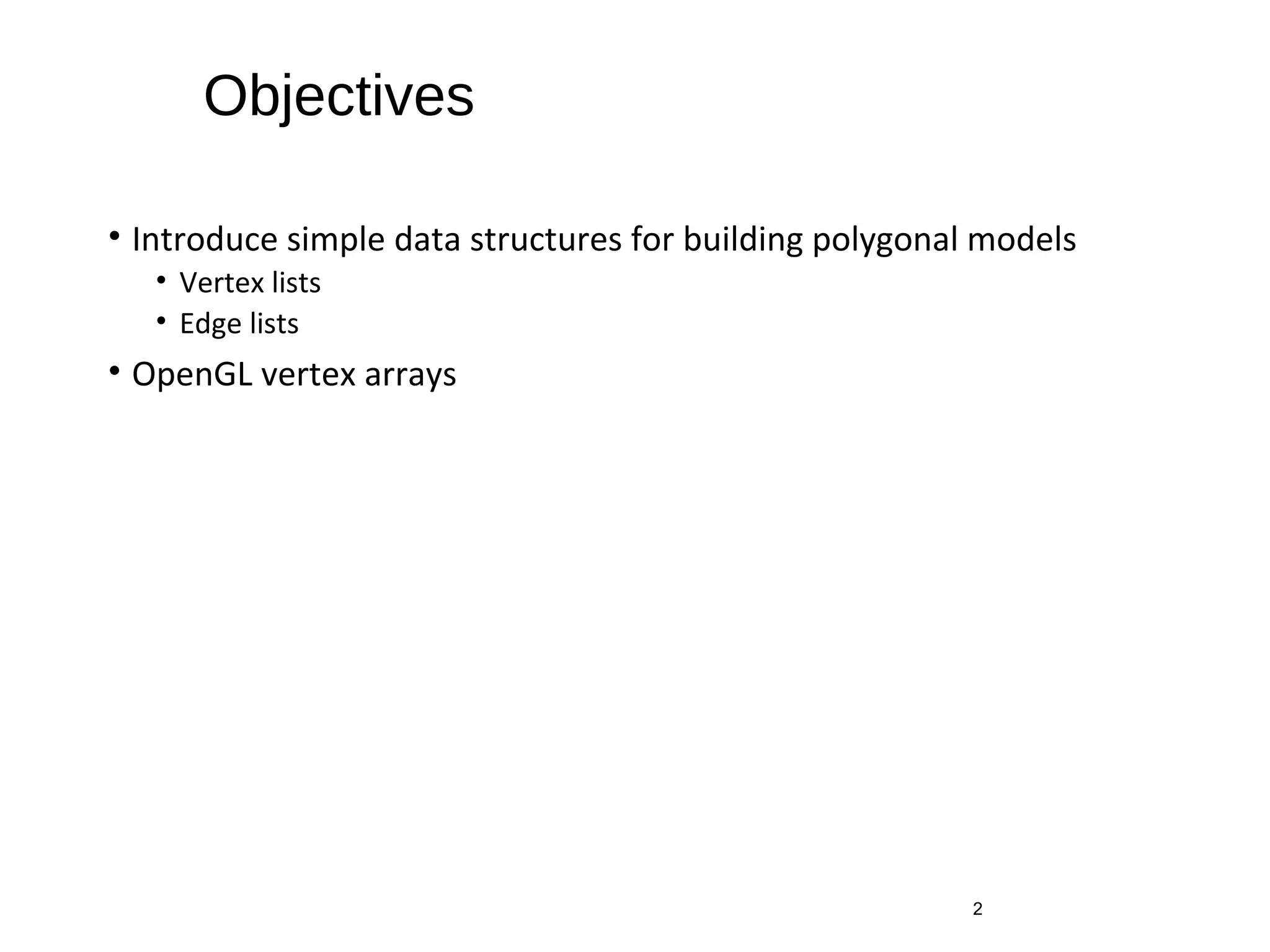 This document introduces different methods for building polygonal 3D models, including vertex lists, edge lists, and OpenGL vertex arrays. It discusses representing the geometry and topology of a mesh and describes how to model a cube using vertex and color arrays, draw polygons from index lists, and efficiently draw the entire cube model with one OpenGL function call using vertex arrays.