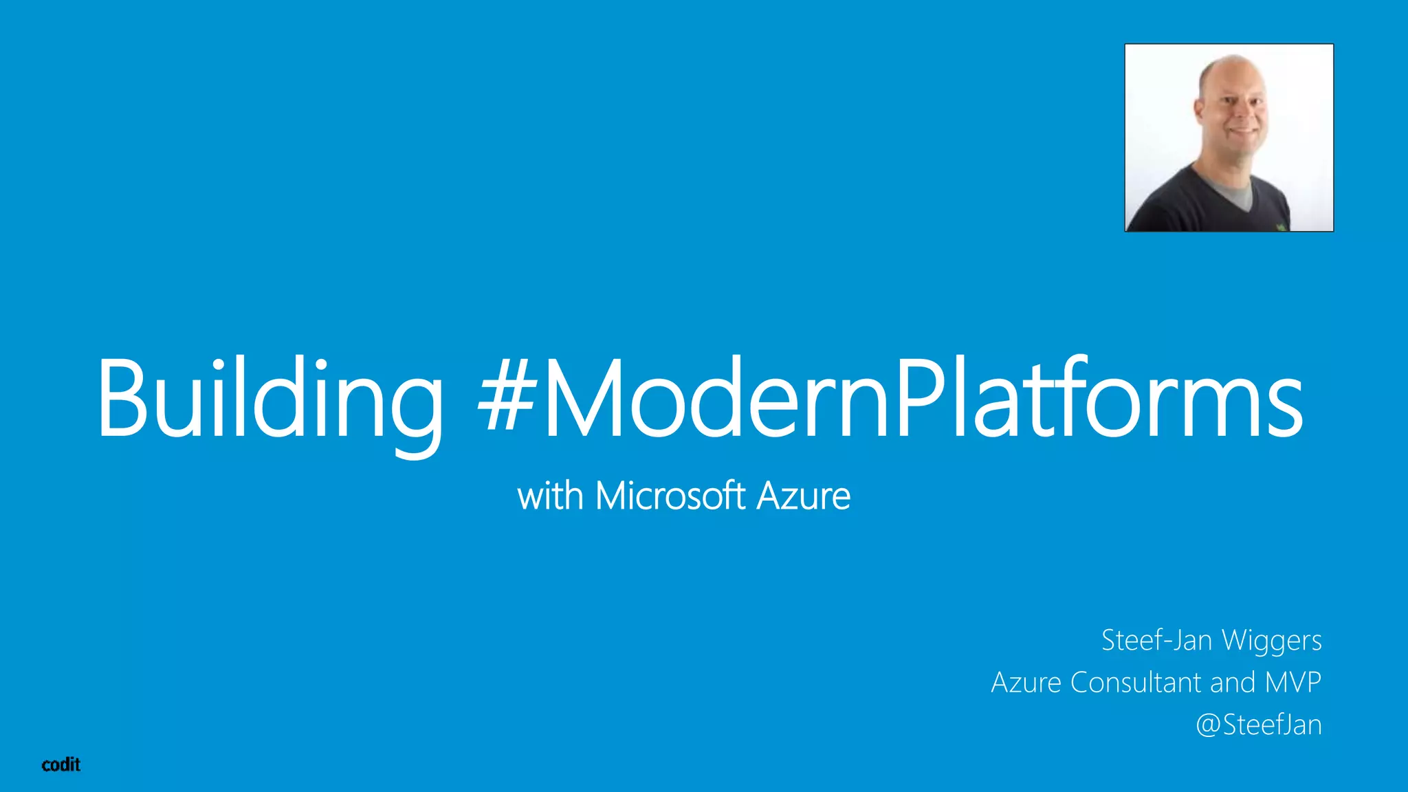 The document discusses building modern platforms using Microsoft Azure, highlighting its role in digital transformation through innovations in data, AI, and IoT. It provides examples of successful implementations, emphasizing benefits like automated data sharing, hybrid cloud solutions, and enhanced efficiency in various industries. The text also showcases Codit's expertise in Azure services, their methodologies, and resources for further information.