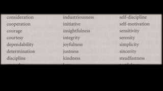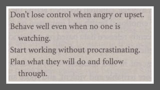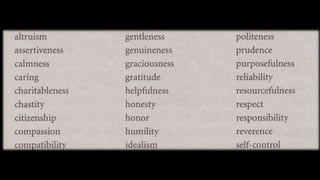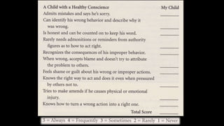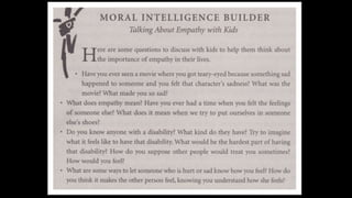 The document emphasizes the urgent need for character education and moral development in students, highlighting a societal crisis characterized by increasing youth violence, substance abuse, and disrespect for authority. It presents strategies for fostering moral intelligence and self-control in children, advocating for examples set by teachers and parents, and teaching essential virtues to cultivate empathetic and responsible individuals. The content urges educators and parents to commit to raising morally sound children through practical applications and by reinforcing positive behaviors.