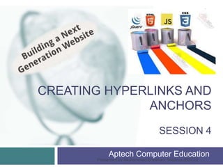 This document discusses how to create hyperlinks and anchors in HTML. It covers: