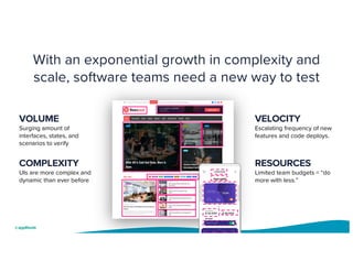 The document discusses the need for no-code autonomous testing solutions due to increasing software complexity and limited resources within engineering teams. It highlights the inefficiencies of traditional test automation, which struggles to scale amid continuous deployment demands, and emphasizes the importance of achieving higher test coverage while minimizing human involvement. The proposed autonomous testing framework offers features like easy setup, self-maintaining test suites, and cross-device testing to streamline the testing process.