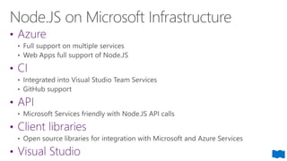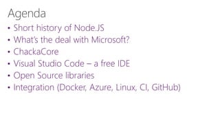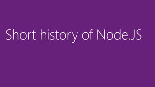 The document provides an overview of Radu Vunvulea, a technology enthusiast and Azure MVP, highlighting his involvement with Node.js and various related technologies from 2009 to 2016. It discusses the development of Node.js, its features, and its integration with tools like Visual Studio Code and Docker. Additionally, it includes personal information such as his blog, email, and social media links.
