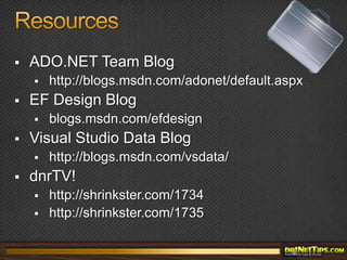 The document outlines resources for building n-tier applications using Entity Framework, including session videos, slide decks, demo projects, and interview questions from the DotNetDave conference. It explains concepts such as data models, Object-Relational Mapping (ORM), and Microsoft's Entity Framework, emphasizing the importance of productivity and database independence. Additional details include the framework's capabilities, LINQ integration, and WCF Data Services for exposing RESTful data services.