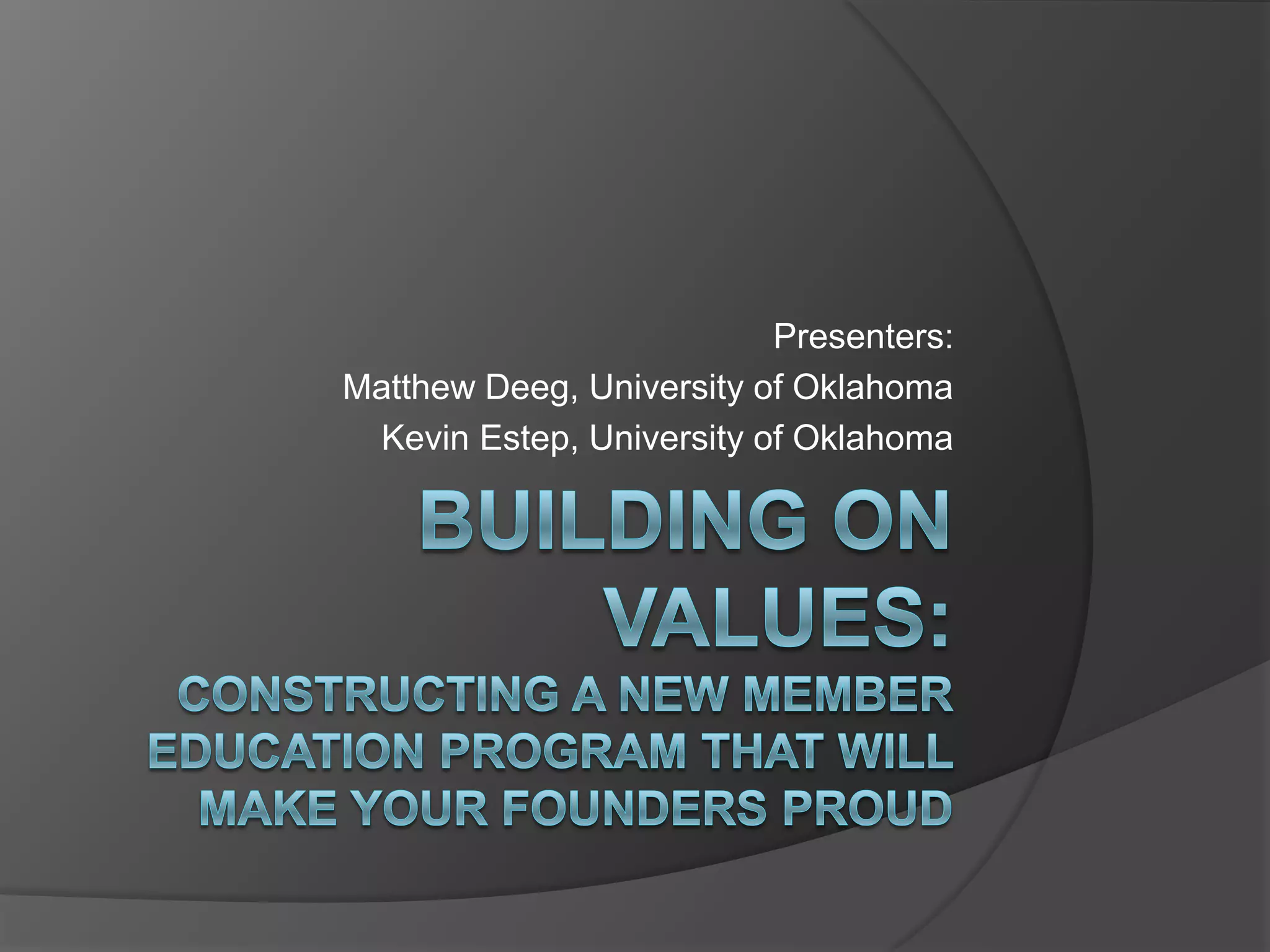 This document outlines how to build a new member education program focused on fraternal values. It discusses framing the problem of members not understanding values and leaving the chapter. Presenters recommend constructing a program around core values through meaningful activities rather than time-wasters. They provide a sample week-by-week breakdown focusing on values like academic excellence and service. The goal is for new members to learn values by doing and for programming to keep older members engaged by meeting their needs through continued education on values. Questions from attendees are invited at the end.