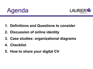 This document provides guidance on organizing one's online identity. It discusses defining a digital identity and online CV. Key questions to consider include one's online presence and goals. Case studies demonstrate organizing profiles across various platforms like a university webpage, blog, social media, and scholarly databases. A checklist is provided to evaluate one's university page and create online publication profiles, including Google Scholar, Scholars Commons, and ORCID ID. Engaging in social media is also addressed, with tips on privacy settings, consistency, and helping others find your online profiles.