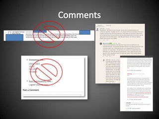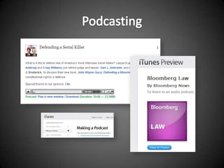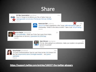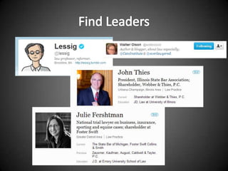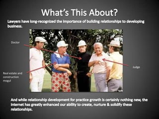This document discusses the importance of lawyers managing their online presence and reputation. It recommends that lawyers assume everything they do online is public, consider how clients and others may search for them online, and follow ethical rules of conduct. Lawyers are advised to thoughtfully consider how to authentically and politely represent themselves online through writing, speaking, and in-person interactions to build their reputation through positive word of mouth referrals on the internet. Maintaining an active online presence through sharing knowledge and staying engaged with readers can help lawyers become a trusted source of information and expertise in their field.