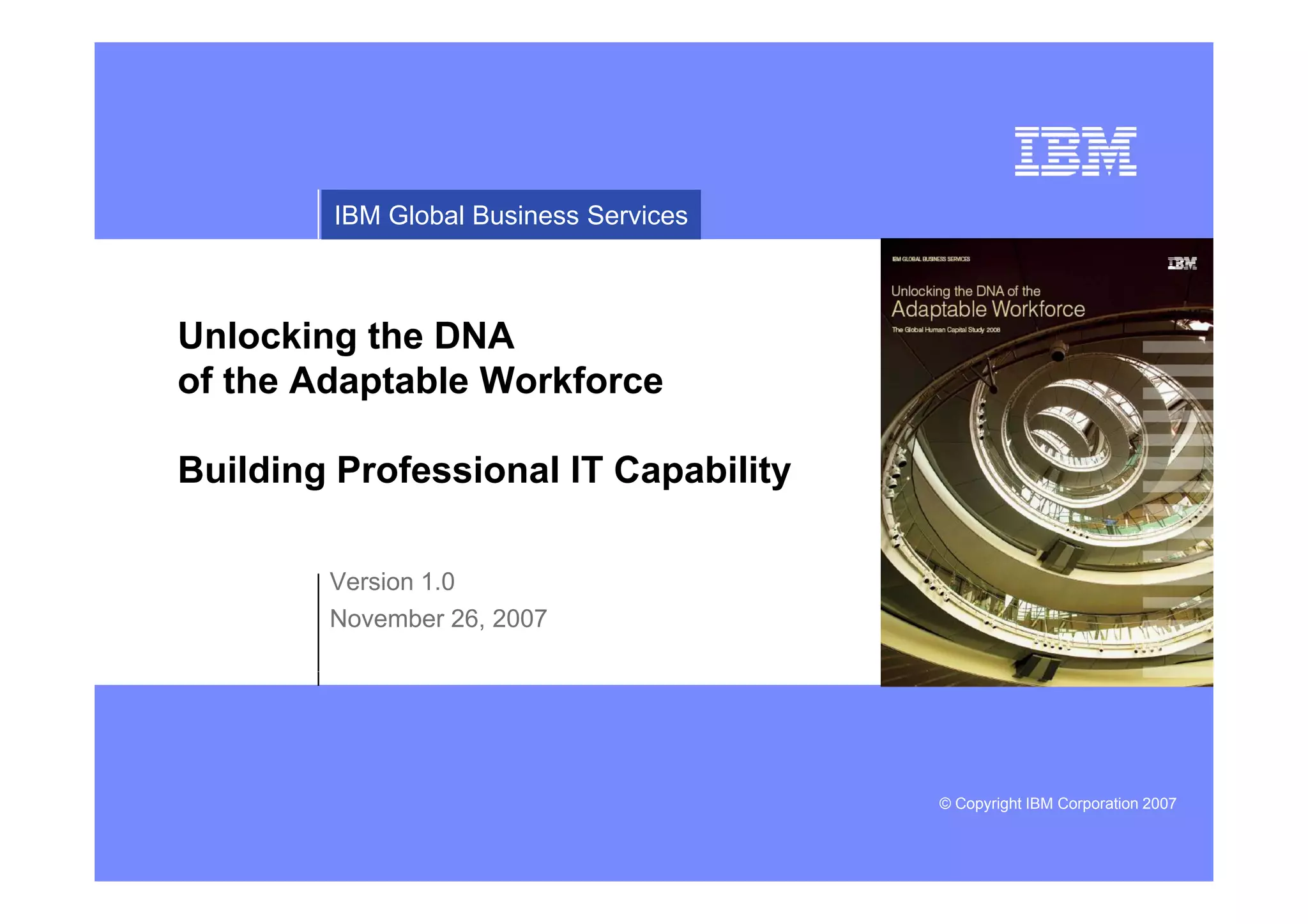 The document discusses building professional IT capability. It summarizes IBM's study of 404 companies regarding how they are improving workforce performance. Developing an adaptable workforce is critical to compete in today's changing environment. However, only a small number of companies believe their workforce is very capable of adapting. To build adaptability, companies should focus on predicting future skills, locating expertise, and fostering collaboration. The barriers to collaboration are often organizational rather than technical. Effective talent management and workforce analytics are also needed to enhance performance.