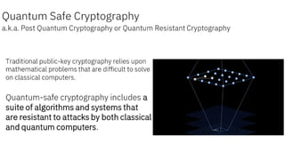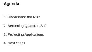 The document outlines strategies for building quantum-safe applications using open-source tools, emphasizing the importance of post-quantum cryptography and risk mitigation. It covers key aspects such as understanding risks, protecting applications, and integrating quantum-safe algorithms into existing systems. Additionally, resources for further learning and inventorying cryptographic assets are provided.