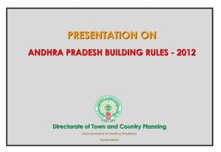 The document presents the Andhra Pradesh Building Rules - 2012. It discusses the purpose of building rules as regulating building activities and facilitating planned development. It outlines the key parameters controlled by building rules, such as plot size, road width, setbacks, height restrictions, and more. It notes that previously, building rules varied across different urban local bodies, and uniform rules were needed. The new 2012 rules introduce changes like a single table outlining height limits and road width requirements for different building types and areas. It also discusses restrictions for building near areas like railways, airports, and defense establishments.