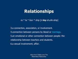The document provides insights on building and managing relationships, focusing on identifying contact sources, engaging in meaningful conversations, and qualifying connections. It emphasizes the importance of regularly updating and communicating with one’s network while establishing a routine for consistent interaction. Strategies for assessing the potential of relationships and promoting mutual value are also discussed.