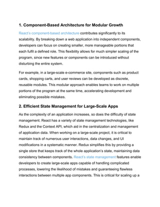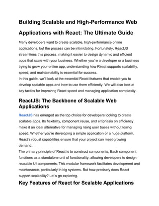 React offers a robust set of tools and techniques for building scalable web applications. From its modular component architecture to its powerful state management options and performance optimization strategies, React is well-suited for handling the demands of large applications. By leveraging React’s capabilities alongside backend technologies like Node.js and GraphQL, developers can create fast, efficient, and scalable web applications that grow with the needs of the business.