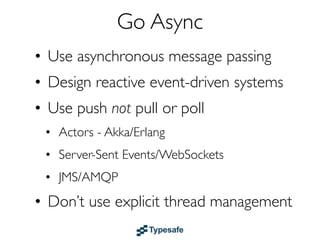 The document discusses lessons learned from building scalable, highly concurrent, and fault-tolerant systems, noting that shared mutable state and threads can lead to non-deterministic code, and recommending approaches like dataflow concurrency, actors, and software transactional memory to avoid these issues. It also advocates designing systems to be reactive by using asynchronous messaging and non-blocking I/O, and to be fault-tolerant using failure recovery mechanisms like those enabled by actor models.