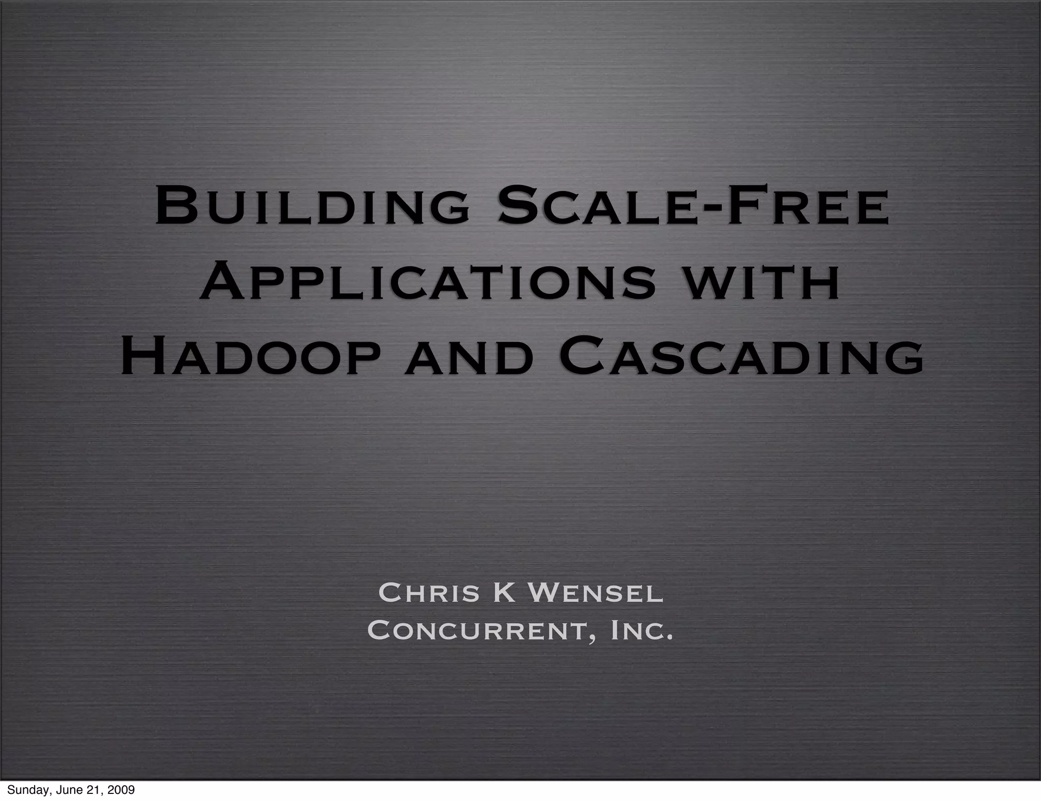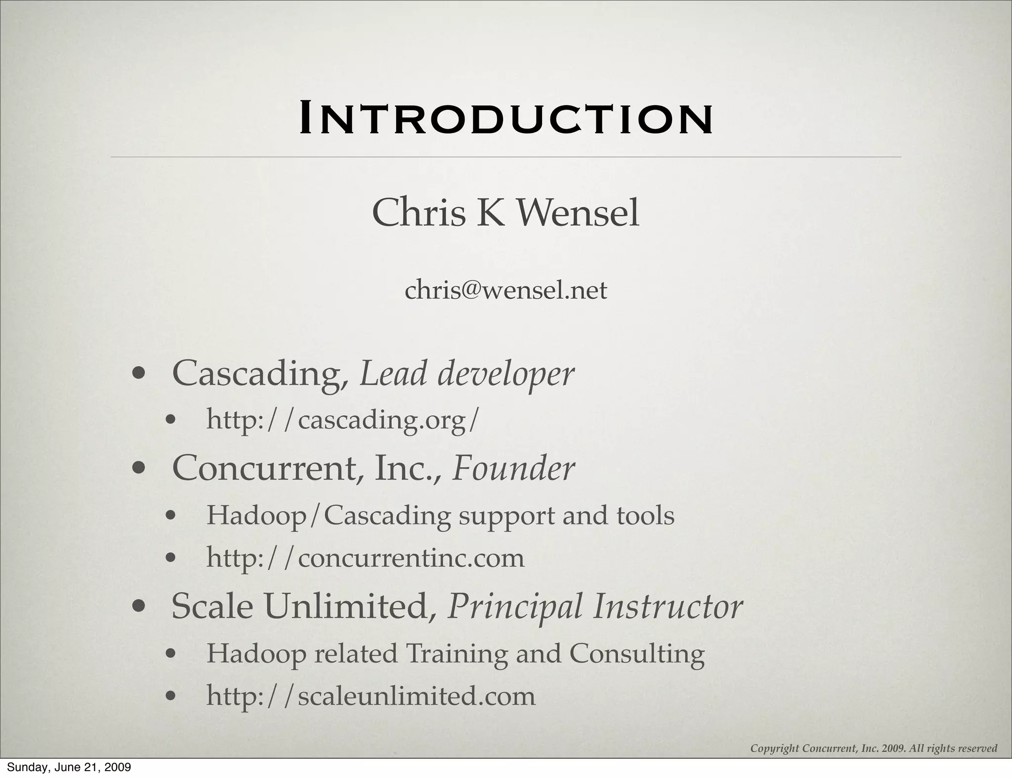 The document introduces Hadoop and Cascading, highlighting their architecture and application in processing big data through MapReduce patterns. It covers the physical architecture of Hadoop, deployment strategies, best practices, and the concept of thinking in MapReduce for effective data processing. Additionally, it emphasizes the use of Cascading as an alternative API to simplify workflows with fields, tuples, and built-in relational operations.