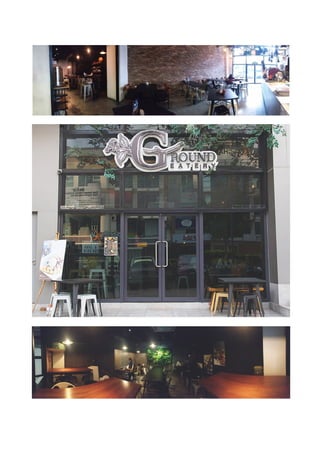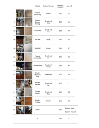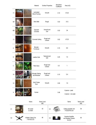 The document provides details on lighting and acoustic studies conducted for the Ground Eatery Cafe. It includes:
