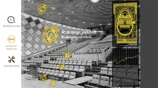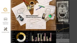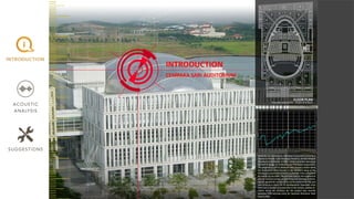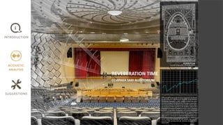This document provides information about an acoustic analysis project conducted on the Cempaka Sari Auditorium in Putrajaya, Malaysia. It includes the team members, tutor, introduction to the auditorium, location, methodology used, analysis of the shape and form, materials, sound propagation, internal and external noise sources, background noise measurements, reverberation time calculation, and sound reinforcement system. Suggestions are provided to improve noise suppression and the architecture design. References are listed at the end.